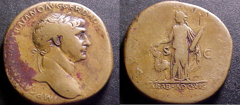 From the Dr. Jones collection obv : IMP CAES NERVAE TRAIANO AVG GER DAC PM TRP COS VI PP rev: ARAB ADQVIS SPQR OPTIMO PRINCIPI SC Bust right , draped left shoulder(Banti27) other variety: bust right (RIC614), All Varieties are considered Scarce.