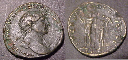 from the Matthew Sersch collection obv : IMP CAES NERVAE TRAIANO AVG GER DAC PM TRP COS V PP rev: SPQR OPTIMO PRINCIPI SC 33mm 18.5g Bust right, draped left shoulder 103-111ad RIC549, Banti 221 This type also appears with: bust right aegis (Banti 222)
