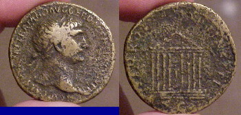 This reverse depicts an octastyle temple with statue holding sceptre and cornucopiae between columns, 5 statues on roof.. This temple appears wide on some coins, narrow on others.